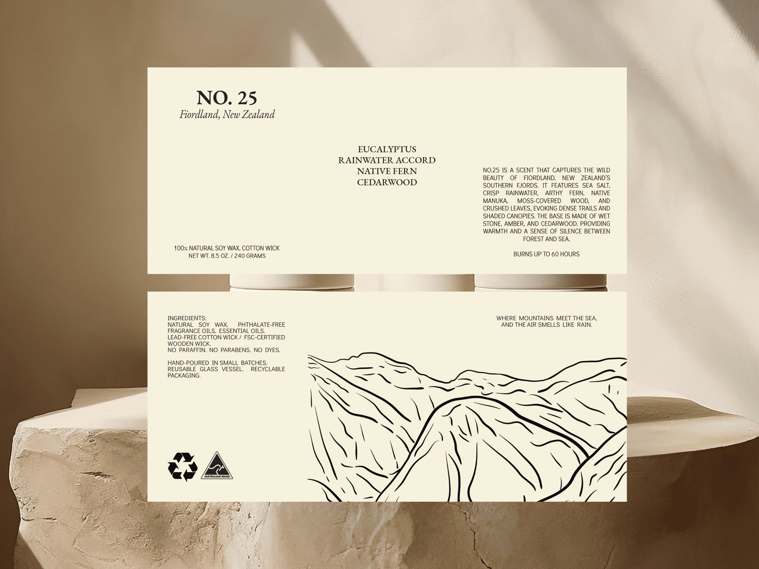 The main challenge was creating a minimalist, memory-led design that felt both personal and purposeful. Each label was approached with intentional clarity, using typography that reads like a journal entry. The box design features a hand-drawn illustration based on a photo captured while traveling, turning the packaging into a keepsake. A monochromatic palette was used to let scent and story take center stage. The design system is rooted in simplicity, wanderlust, and storytelling. It also embeds sustainable values through small-batch production and eco-conscious material choices.